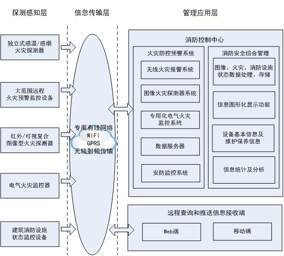 就探测感知层而言,实现古城远、中、近三层距离探测,远处在古城周边设置高点,采用大范围多光谱遥感雷达火灾预警系统和大范围红外/可视复合图像热灾害火灾探测装置,中距离采用已经在街道安装的视频摄像机进行视频烟火分析,近距离在建筑内使用电气火灾监控系统和无线独立式火灾探测系统以及相应的传感探测手段